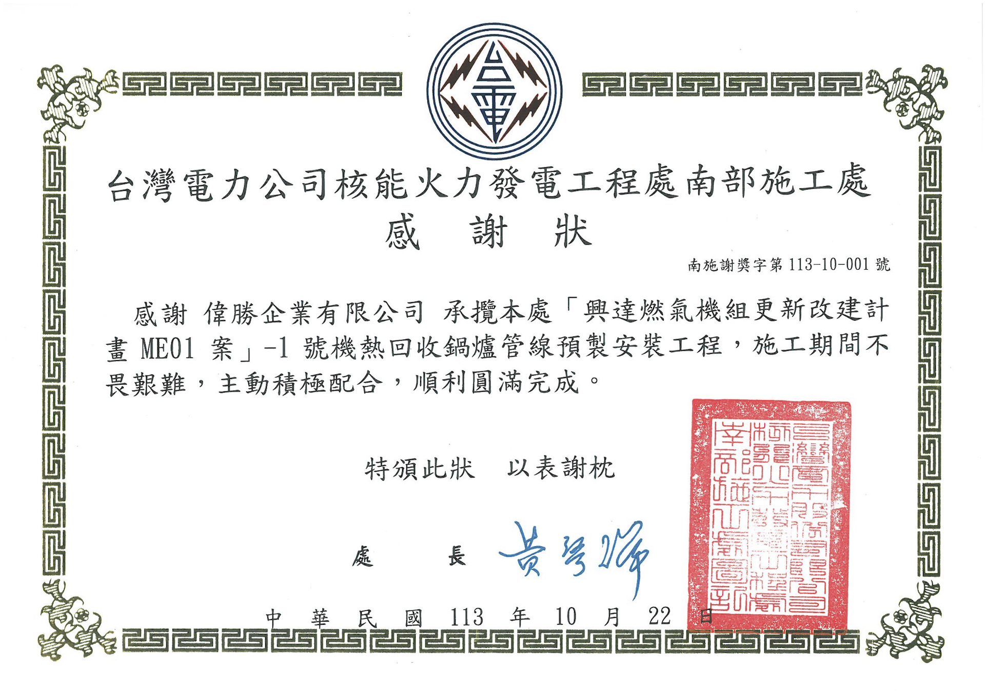 We sincerely appreciate the Certificate of Appreciation presented by the Southern Construction Office of the Nuclear and Thermal Power Engineering Department, Taiwan Power Company (Taipower), in recognition of WSC-Weisun Co., Ltd.’s outstanding performance in the prefabrication and installation of heat recovery boiler piping for Unit 1 of the ME01 Project – Hsinta Gas-Fired Unit Renewal Program.
